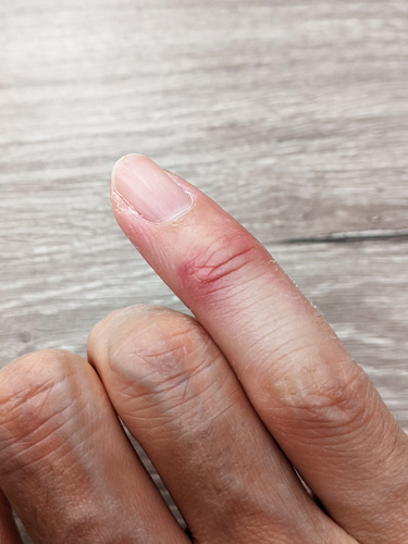 突き指かな・・・関節のところが赤くなってもうた・・・。